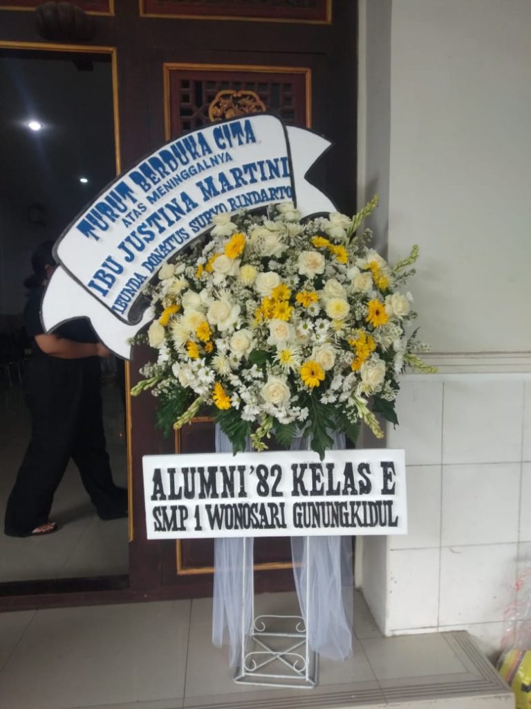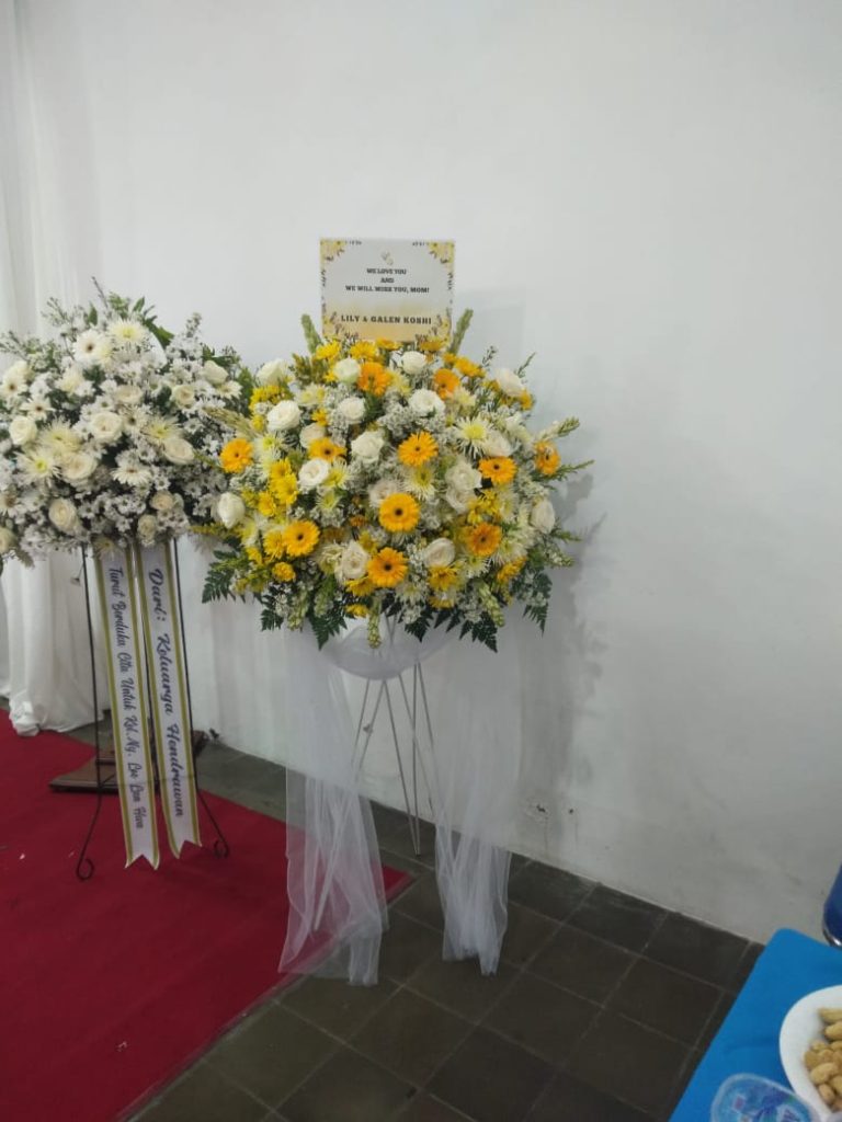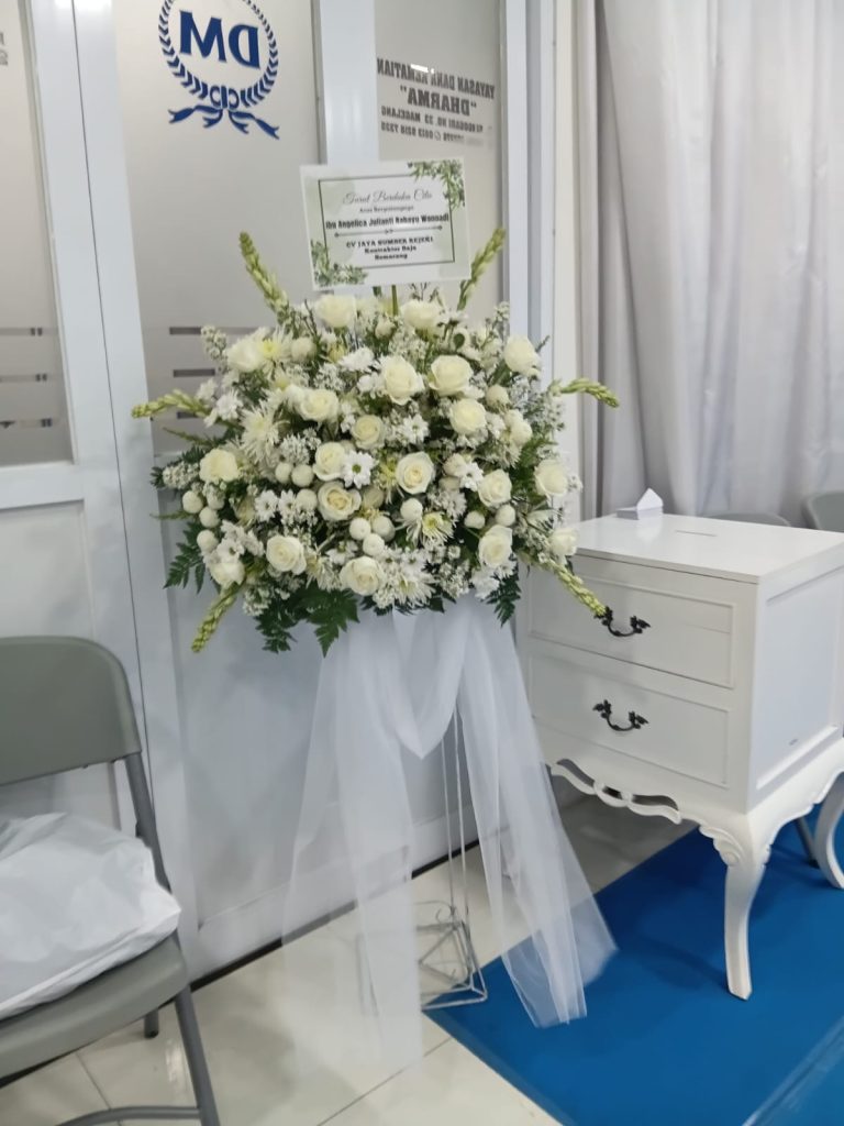 Selain untuk acara bahagia, standing flower magelang juga sering digunakan sebagai ungkapan belasungkawa. Dalam momen duka, standing flower magelang biasanya menggunakan warna yang lebih lembut dan tenang. Rangkaian bunga seperti krisan putih, lily putih, dan mawar putih sering digunakan karena melambangkan ketulusan serta penghormatan kepada almarhum.